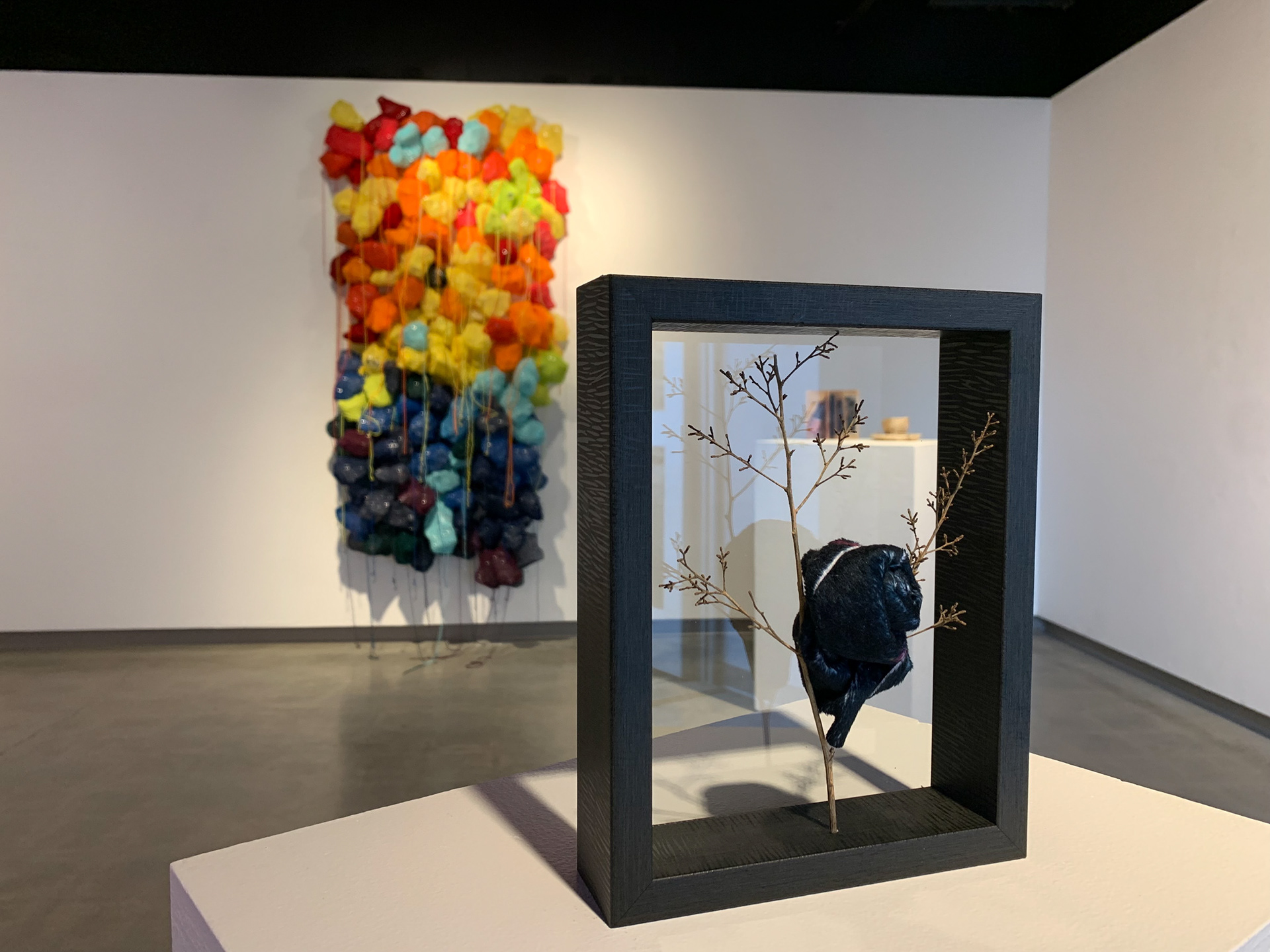 Printed Gelora on velvet fabric, dried branch, wood frame with glass, 6 x 9 x 2 inches